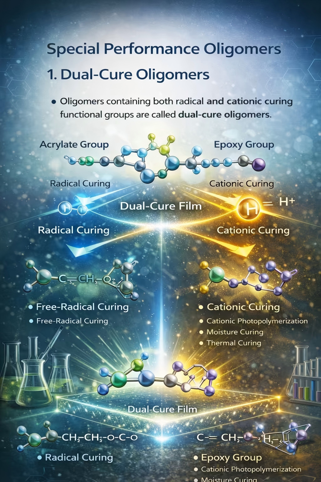 If an oligomer contains two different types of active functional groups for curing, such as an acrylate group that can undergo free-radical curing, and another group that can undergo cationic photocuring, moisture curing, hydroxyl curing, or thermal curing, then it is called a dual-cure oligomer.